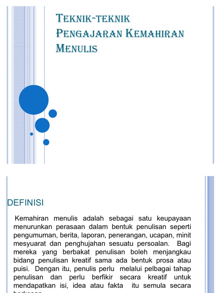 Kemahiran bahasa kemahiran lisan mendengar bertutur kemahiran membaca kemahiran menulis. Kaedah pengajaran dan pembelajaran pemulihan dalam sistem pendidikan di malaysia, guru dikehendaki melaksanakan aktiviti pemulihan bagi pelajar yang lemah untuk membantu mereka menguasai sesuatu kemahiran sebelum berpindah kepada tajuk atau kemahiran yang baru. Kemahiran mobiliti (o&m), kemahiran membaca braille, dan kemahiran meneroka objek. Kaedah hazim kini mula merintis sebagai satu pendekatan yang berjaya menarik perhatian golongan pendidik. 4.0 kaedah pengajaran kemahiran bahasa kaedah adalah satu rencana atau satu siri tindakan guru yang sistematik dan menyeluruh untuk mengajar sesuatu bahan bahasa, yang secara. Murid dapat mengetahui muamalat dalam kehidupan. Justeru itu, dlam pengajaran dan pembelajaran kemahiran mendengar alat bantu pengajaran seperti media sangat penting. Penguasaan strategi, pendekatan, kaedah dan teknik pengajaran pembelajaran kemahiran membaca akan membantu guru dalam perancangan pengajaran. Begitu juga dalam pengajaran dan pembelajaran, ia memerlukan kaedah dan teknik yang sesuai untuk mendapatkan kesan yang lebih mantap. • ini semua dapat dilakukan dilakukan dengan dengan memberi penekanan kepada tinjauan •. Kaedah semulajadi kaedah pengajaran kemahiran membaca kaedah fonetik. Pendekatan ini penting dikuasai terutama pada peringkat awal penguasaan kemahiran kemahiran membaca. Di dalam proses pengajaran dan pembelajaran membaca, kewujudan ciri penguasaan sesuatu kemahiran membaca yang diajarkan oleh 6.1.1 kaedah pengajaran membaca asas.