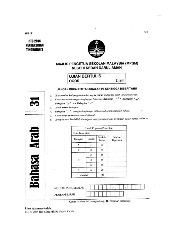 Related : Soalan Bahasa Arab Pt3 : Trial examination papers + answers..
